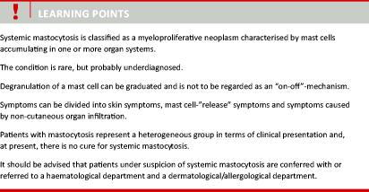 Introduction: The mast cell lives a hidden life, but it is implicated in several physiological reactions. Its ability to react to different stimuli impacts a variety of conditions such as asthma, atopic dermatitis, urticaria and anaphylaxis. It is not until recent decades that the evolution of the cell has been described and its fascinating biology has only recently been depicted. We here give a review of systemic mastocytosis in regards to cell biology, diagnostic approaches and clinical practice.