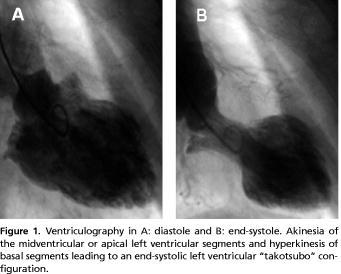 Takotsubo cardiomyopathy (TC) is a recently described cardiac syndrome with clinical and paraclinical manifestations mimicking ST-segment elevation myocardial infarction (STEMI) [1-8]. Patients with TC are characterized by: 1) symptoms, electrocardiographic changes and elevated cardiac biomarkers mimicking STEMI, 2) reversible wall-motion abnormalities involving apical and mid-portions of the left ventricle (LV), 3) absence of significant obstructive coronary disease or other conditions which may lead to LV systolic dysfunction (e.g., intracranial or sub-arachnoid haemorrhage, myocarditis, cocaine, hypertrophic cardiomyopathy etc.) and 4) a favourable prognosis [3, 4, 7].