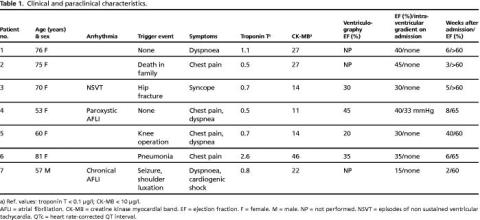 During hospitalization five patients had clinical signs of heart failure, of which two patients were in cardiogenic shock requiring inotropic therapy (patient 3: dopamine, patient 7: dobutamine). Three patients had transient episodes of non-sustained ventricular tachycardia. Two patients had or developed pneumonia, which was treated by antibiotics.