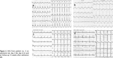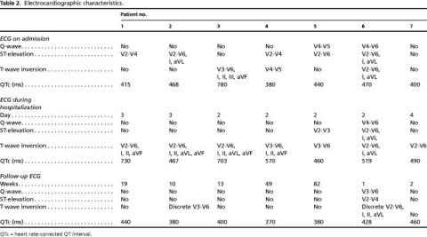 Electrocardiographic data are presented in Table 2 . Figure 2 shows ECGs from two patients on admission, during hospitalization and at follow-up. ST-segment elevation in the admission ECG was documented in five of seven patients whereas Q-waves were present in two. T-wave inversion was present on the admission ECG or on subsequent ECGs in all patients. The QTc interval was prolonged in all patients during the hospital stay. One patient received treatment with a potentially QTc-prolonging drug (cipramil 20 mg/day, patient 1) before admission. Follow-up ECG normalized in six patients except from the presence of discreet T-wave inversion in two patients. Only one patient had sustained Q-waves in the ECG (follow-up at one week). The QTc interval normalized in patients with > 2 weeks of follow-up.