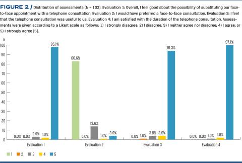 The distribution of answers to evaluations 1-4 are given in Figure 2. A total of 100 (97.0%) of the families agreed or strongly agreed that they felt good about being offered a substitute telephone consultation; 14 (13.6%) said that a telephone consultation was not the best option, whereas 89 (80.4%) would not have preferred a face-to-face consultation; 98 (95.1%) felt that the telephone consultation was useful for them; 102 (99.0%) responded that they were satisfied with the duration of the telephone consultation. All patients had re-scheduled face-to-face consultations 4-12 weeks after the substitute telephone consultation.