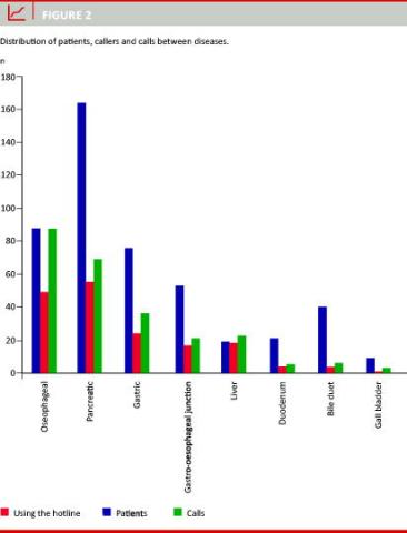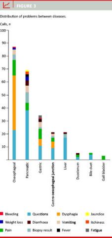 The various disease groups displayed some differences with regard to the reported problems, but with the exception of oesophageal cancer, the most frequent issue in all groups was elaborate questions. Was it not for dysphagia in oesophageal cancer, the percentage of patients using the hotline would have been approximately the same for all disease groups.