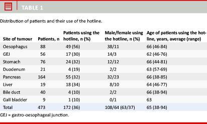Men made more use of the hotline than women. However, the ratio did not differ significantly from the male-female ratio in the studied population. This is due to the skewed number of males with cancer in either the oesophagus (the gastro-oesophageal junction) or the stomach.
