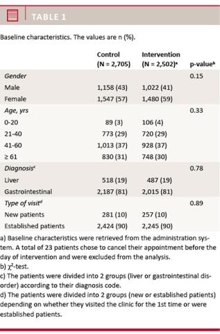 A total of 2,705 and 2,502 appointments were scheduled in the control and intervention periods, respectively. The baseline characteristics of the two groups were similar (Table 1). In all, 23 patients had cancelled their appointment before the day of the intervention. Consequently, 2,479 patients in the intervention group were included in the analyses.