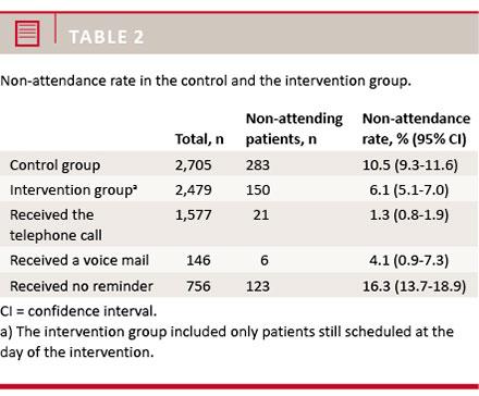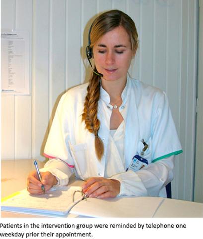 Results: In the intervention group, 1,577 (64%) patients answered the reminder telephone call. The non-attendance rate was significantly lower in the intervention group (6.1%) than in the control group (10.5%) (p < 0.00001). Only 1.3% of the patients who answered the reminder turned out to be non-attendees. The most common explanation for non-attendance in the intervention group was forgetfulness (39%). The reminder telephone call was cost-effective.