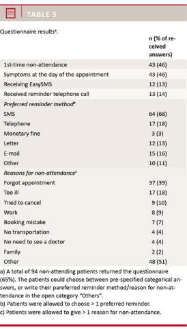 attended and if they had received an SMS reminder (EasySMS). Prior to the study, the questionnaire was validated through interviews with 15 patients. The questionnaire was validated for linguistics, construction and contents.