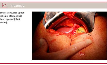 Indication for surgery was based on the patient’s clinical condition and the laboratory tests (primarily white blood cell count and C-reactive protein) combined with the findings at computed tomography (CT). A systematic description of the CT finding by, e.g., the modified CT severity index [6] was not used at our institution. In addition, our approach on these patients was to avoid pre-operative puncture/drainage of the fluid collection and, thus, preoperative culture was not done. Patients were operated via either an upper midline or a transversal subcostal incision. Intraoperative ultrasonography was used to decide the site of incision of both the anterior and the posterior wall of the stomach (Figure 2). After taking a sample for bacterial culture, necrosectomy was performed digitally or using a sponge forceps. The aim was to remove all loose dead tissue. Repeat peri-operative ultrasound and flushing of the cavity with saline water were done in order to accomplish this. An approximately 3-cm anastomosis between the cavity wall and the posterior stomach was made by interrupted sutures so that non-demarked dead tissue could later pass through to the stomach and additional intervention should be unnecessary. A tube was left in the stomach and the incision of the anterior stomach was closed in one or two layers according to the surgeon’s preference. Preoperative antibiotics (cefuroxime/meropenem and metronidazole) were administered and this treatment was continued post-operatively and changed according to the found bacteriology. Liquids were allowed the following day, and patients started solid food intake on an individual judgment. Patients discharged alive were seen in the outpatient clinic after one and three months. If
