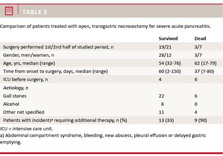 Results: A total of 50 patients had surgery. The median age was 55 years (range: 17-79 years). The presumed aetiologies were: gallstones (n = 28), alcohol (n = 8) and other causes (n = 14). The median preoperative stay at hospital was 50 days (range: 2-150 days). Bacterial culture from the necrotic tissue was positive in 26 patients (52%), negative in 15 patients (30%); and in nine patients, no information on this was available. In all, 22 patients (44%) had one or more incidents (i.e. abdominal compartment syndrome, bleeding, new abscess, pleural effusion or delayed gastric emptying) where additional invasive therapy was needed. Ten patients (20%) died during their admission to our department. In total, 18 (45%) patients developed late complications defined as endocrine and/or exocrine malfunction of the pancreas (diabetes (n = 10), exocrine insufficiency (n = 4), both diabetes and exocrine insufficiency (n = 4)).