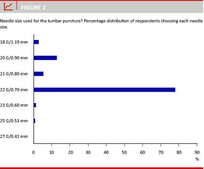 A considerable proportion of doctors used needle size 22 G or larger (Figure 2) and 74% used traumatic needles. 18% did not know whether they used traumatic or atraumatic needles. Some stated that they used two different needle sizes, depending on the indication for LP. There was considerable disagreement among respondents as to whether the indication for LP should determine the needle size (33% said yes and 59% said no).