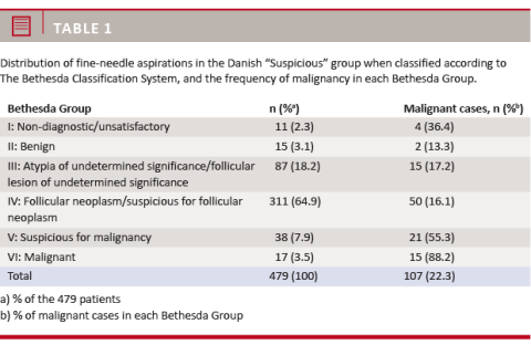 CONCLUSIONS: The Danish “Suspicious” group contains a broad spectrum of BG with varying malignancy risk. The results indicate a need for standardisation of the Danish FNA classification. A national introduction of the TBCS might secure an international and comparable standard.