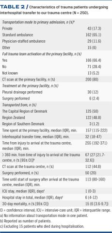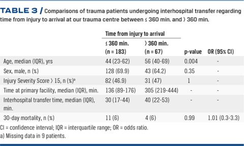 In the study period, 250 patients underwent interhospital transfer to our trauma centre. The median age was 47 years (interquartile range (IQR) 26-65), the majority were male (68.4%) and a total of 113 patients (46.9%) had an Injury Severity Score (ISS) > 15. The 30-day mortality was 6% (95% confidence interval (CI) 3.6-9.7). The median time from injury to arrival at our trauma centre was 255 minutes (IQR 192-371). We found that 67 patients (27%; 95% CI 21.7-32.6) arrived at our trauma centre more than 360 minutes after time of injury. The patients arriving later than 360 minutes were significantly older (p = 0.004) than the remaining patients. There was no significant difference in the unadjusted 30-day mortality (odds ratio (OR) 1.01, 95% CI 0.3-3.3).