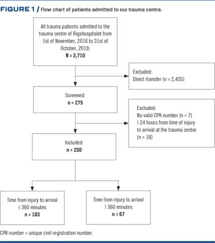 A total of 2,710 patients were admitted to the Trauma Centre at Rigshospitalet during the period from 1 November 2016 to 31 October 2019. Interhospital transfer occurred for 275patients (10.1%). We excluded 25 patients, leaving a cohort of 250 patients (Figure 1). The median age was 47 years (IQR 26-65), most were male (68.4%) and 113 patients (46.9%) had an ISS > 15 (Table 1). At the primary facility, a full trauma team was activated in 66.4% of the admitted patients and the median time spent from arrival to departure from the primary facility was 157 minutes (IQR 115-222) (Table 2). The median time from injury to arrival at our trauma centre was 255 minutes (IQR 192-371), including a median interhospital transfer time of 32 minutes (IQR 18-47). The 30-day mortality was 6% (95% CI 3.6-9.7). In 183 patients, the time from injury to arrival at our trauma centre was lower than 360 minutes, whereas 67 patients arrived more than 360 minutes (27%; 95% CI 21.7-32.6) (Table 2) after sustaining their injury. Arrival according to a 240 minute-interval and a graphical representation are shown in supplementary files (Table 4, Figure 2, https://ugeskriftet.dk/files/a03200138_-_supplementary.pdf).