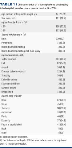 Trauma is the leading cause of death in younger people up to 49 years of age, causing as many as 5 million deaths worldwide annually [1]. In well-organised trauma systems, the most severely injured patients should be brought directly to a major trauma centre because treatment at major trauma centres seems to be associated with a much lower mortality after trauma than treatment at less specialised institutions [2]. However, severely injured patients may also be brought to a hospital with fewer resources and transfer to a major trauma centre may be needed after initial assessment and stabilisation [3-5].