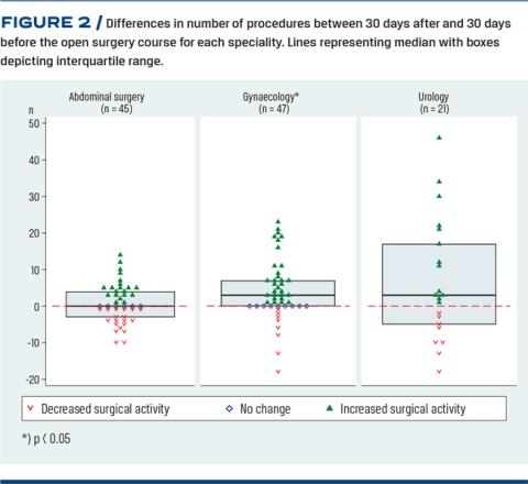 Analyses were stratified by speciality. Differences of non-paired data were analysed using the Wilcoxon-Mann-Whitney test and differences of paired data were analysed using the Wilcoxon signed-rank test. p < 0.05 was considered statistically significant. Results are reported as medians with interquartile ranges, with p-values reflecting differences in surgical activity.