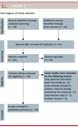 We performed a systematic search in the PubMed and Embase databases on 9 March 2015 using the following words separately and in combination: “transanal”, “TAMIS”, “TME”, “NOTES”, “natural orifice”, “total mesorectal excision”, “ETAP” and “rectal excision”. The following MeSH terms were combined: “Natural Orifice Endoscopic Surgery” and “Rectum/surgery”. The search and the review processes were undertaken by the two authors and followed the PRISMA guidelines [15]. The search was restricted to English articles published during the past six years. The search yielded 76 articles. After crosschecking the reference lists, another 54 articles were retrieved. When duplicates were removed, 91 articles remained. The abstracts were assessed and 36 full-text articles were retrieved and reviewed systematically for eligibility. The inclusion criteria were studies on rectal resection in which the mesorectal excision involved transanal dissection – solely or in addition to abdominal dissection. Due to the scarcity of the literature, single case reports were also included. Review articles, cadaver and porcine studies were excluded, as were studies on local resection of polyps or cancers along with studies in which the transanal part of the operation involved only specimen extraction. We included 29 studies counting a total of 336 patients (Figure 1).