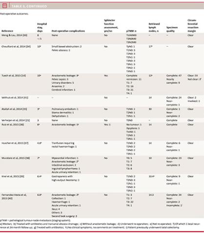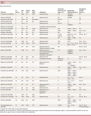 lower two thirds of the rectum. The seven largest series in this review [13, 14, 26, 29, 31, 40, 41] included low and mid-rectal tumours. Some authors [13, 39] also included high-rectal tumours. Tuech et al [14] only included tumours located at or below 5 cm from the anal verge. Rouanet et al [26] specifically selected patients with advanced or recurrent rectal cancer in patients with a narrow pelvis, bulky mesorectum, high BMI, large prostate, fibrosis or advanced anterior tumours. They occasionally changed to TaTME intraoperatively. Verheijen et al [21] operated a non-obese, female patient with a wide pelvis and no co-morbidities. A clear selection bias related to the study cohort is reported in five
