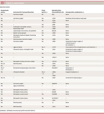 This review included 336 patients, most with a normal BMI. There is a tendency towards the use of flexible platforms for the transanal part of the procedure. The optimal pressure for the pneumo-perirectum is generally around 10 mmHg. The optimal dissecting instrument for the transanal part has yet to be defined, although modern sealing devices seem to be popular. Anterior dissection in the transanal part should be performed with caution due to risk of urethral injury, and in the lateral part due to the risk of injury to the neurovascular bundle.