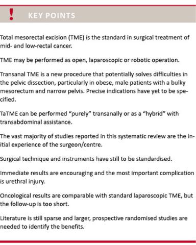 Results: A total of 29 studies (336 patients) were included. Only low-quality evidence is available, and the literature consists of case reports and case series. Studies represent the initial experience of surgeons/centres. No precise indication for TaTME is yet specified other than the presence of mid and low rectal tumours, although the potential advantages seem to be related to a bulky mesorectum in the male pelvis. The preliminary results are encouraging and the most serious complication is urethral injury. The oncological results are acceptable, although the follow-up is short.