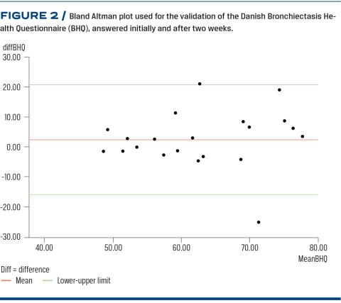 Results: There was a significant convergent validity between the BHQ1 and the SGRQ (ρ = –0,826, p = 0.0001), a satisfactory correlation coefficient between the BHQ1 and the BHQ2 (0.739) and a lower limit of agreement of –15.96 and 20.56 in the Bland Altmann plot.