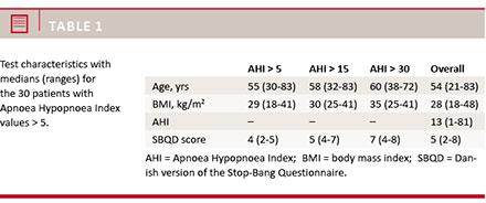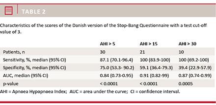 30 of the patients were found to have an AHI above 5. Table 2">Table 2 shows the results for specificity and sensitivity for an SBQD cut-off of ≥ 3 points, for AHI levels of > 5,