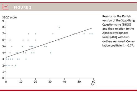 Results: Most of the patients were men (79%). The overall median age was 54 years (range: 21-83 years). The median SBQD score for the group with an Apnoea Hypopnoea Index value (AHI) > 5 SBQD was 4 (range: 2-5), AHI > 15 SBQD score 5 (range: 4-7) and AHI > 30 SBQD score 7 (range: 4-8). Setting the SBQD cut-off at three, thereby defining scores 0-2 as normal as proposed by the authors, we observed the following sensitivity (AHI > 5 = 96.6%, AHI > 15 = 100% and AHI > 30 = 100%). The area under the curve was calculated and significant p-values achieved.