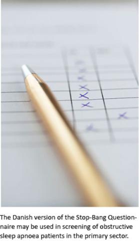 Obstructive sleep apnoea (OSA) is a growing problem [1] as more and more consequences are unveiled through ongoing research on the subject [2]. The risk of circulatory/cardiovascular, metabolic diseases and also endocrine, infectious, nutritional, respiratory conditions and parasitic diseases, among others, were found with an increased odds ratio with the presence of OSA [3]. It is essential to establish relevant, fast, accurate and simple screening options, both in the primary sector and for preoperative screening in hospitals if we are to diagnose and treat this condition and thereby avoid the consequences of untreated disease. As previously described by Jennum et al, OSA is associated with significantly higher rates of health-related contact, medication use and unemployment, and the condition was also associated with increased socioeconomic costs [3]. With a possible underestimation of OSA patients in Denmark, the primary sector in Denmark is lacking a steady referral protocol and screening method for patients suspected of having OSA. In hospitals, a preoperative OSA assessment can help us avoid postoperative complications, such as postoperative cardiac and pulmonary complications, due to occult OSA in patients who undergo surgery for other reasons [4]. Previous research on the choice of questionnaire and pre-operative screening showed very good results in diagnosing patients with OSA using the Stop Questionnaire developed by Chung et al from 2008 [5]. The subsequently developed Stop-Bang Questionnaire (SBQ) [6] has been further revised. In the systematic review by Abrishami et al [7], the SBQ was the recommended tool and had the highest sensitivity for OSA. It has been used in many other countries with success