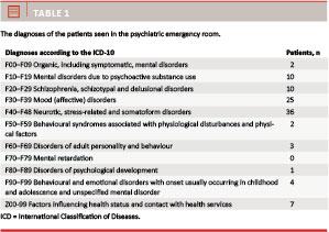 The average age of the patients was 43 years (range 18-87 years). A total of 55 of the patients were women. In all, 26 of the patients were referred to the PER, primarily from other health care providers such as GPs, somatic departments and various psychiatric outpatient settings, but other non-medical operators such as the police and social workers also referred patients. The diagnoses were primarily within the affective and anxiety spectra. These two spectra accounted for nearly two thirds of the diagnoses (Table 1).