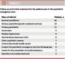 A total of 97 patients were discharged to follow-up elsewhere (Table 2), in several cases at more than one place. Patients were predominantly sent to their GP (46 cases). Other frequent collaborators were: various psychotherapeutic treatment services, private psychiatrists and the Acute Psychiatric Team (this is a team that can contact patients within a few days and support them in their own home during an acute phase). In 22 cases, patients were advised to contact their GP to discuss referral to psychotherapy. Among those, four were for psychological treatment and 18 for referral to a public outpatient psychotherapeutic treatment programme.