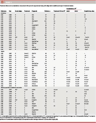 If possible and for reasons of clarity (see methods above), we report results separately for children and adults. From a pool of 2,496 potentially relevant studies, we included 48 studies (three prospective randomised studies (RCT), four prospective non-randomised studies, and 41 retrospective studies) with a total of 3,772 patients (Figure 1). Results from the literature are summarised in Table 1. On the basis of the analysis, we have proposed a treatment algorithm for the management of the appendiceal mass (Figure 2), and evidence-based recommendations are summarised (Table 2). Finally, a brief overview of the overall incidence failure rate and complications after treatment with antibiotics, percutaneous drainage, and surgery is provided in Table 3.
