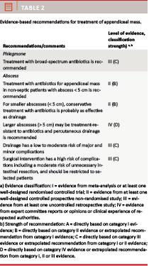 Thus, weak evidence suggests that most adult patients with periappendicular phlegmone can be successfully treated using antibiotics alone.