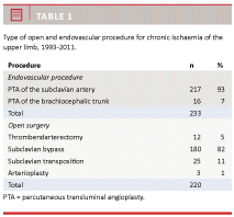Endovascular dilatation, percutaneous transluminal angioplasty (PTA) and stenting of the stenotic lesion in the subclavian or axillarian artery is performed percutaneously. The open procedures include bypasses from the subclavian artery, transposition of the subclavian artery, arterioplasty and thrombendarterectomies (Table 1).