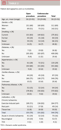 Results: Open reconstructions: Two patients died within 30 days, which is equivalent to a mortality rate of 0.9%. Six (2.7%) reconstructions occluded before discharge. Complications were observed in 41 patients (19%); the complications were predominantly related to surgical wound. At follow-up, 74 (70%) had no symptoms. Endovascular reconstructions: There were six deaths within the first 30 days, which is equivalent to an early mortality rate of 2.6%. Four (2%) reconstructions occluded before discharge. Complications were observed for 23 (10%) patients; the complications were predominantly of neurovascular origin. At follow-up, 90 (74%) had no symptoms. The one-year survival was 95% with no difference between the two groups.