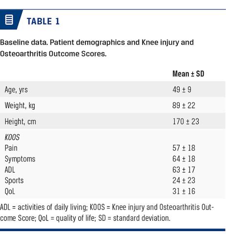 RESULTS: Twenty patients were included in the study and all participated in the follow-up. Only one adverse event was registered; a patient complaint of cosmetic changes to the abdominal subcutaneous tissue. The improvements in KOOS were significant at all follow-up. At one year, KOOS pain had improved by 14 points, symptoms by seven, activity of daily living by 13, sports by 19 and quality of life by 15.