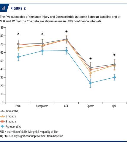 Descriptive data were presented as means and standard deviations for continuous data and as number of patients for categorical data. Density plots of data were performed and visually evaluated for normality. Comparison of baseline KOOS scores at three, six and 12 months was performed using repeated measurement ANOVA. The level of significance was set at p < 0.05.