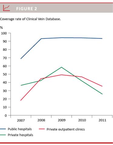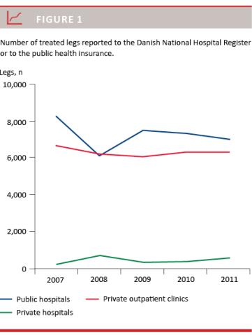 Results: A slight decrease was observed in the total number of treated legs from about 15,000 annually to nearly 14,000 during the period. Public hospitals and private outpatient clinics treat an almost equal number of patients, whereas private hospitals perform 3% of the treatments. The coverage rate of KVD in public hospitals has been almost complete (94%), but it has been approx. 40% in private outpatient clinics and private hospitals. In 84% of the legs, there were only subjective complaints. The remaining 16% had developed complications, i.e. eczema, varicophlebitis, ulcers or bleeding. Operations still make up the vast majority of the procedures, and although the number of endovenous procedures has increased during the period, these procedures account for only 15% of the procedures performed in 2011. Of all legs, 36% had previously been treated for varicose veins.
