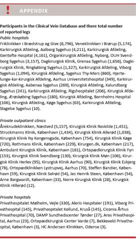 In 1998 the Danish Health and Medicines Authority published a guideline on treatment of varicose veins [1]. It concluded that the treatment of varicose veins in Denmark was performed very heterogeneously, and that the need for retreatment was high. One of the recommendations in the guideline was to establish a clinical database for registration of the quality of treatment of