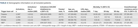 RESULTS A total of 8,075 trigger team activations were recorded, a median of eight calls per day (range: 1-18), covering 16.7% trauma calls, 28.3% STEMI calls, 19.7% stroke calls and 35.3% MEP calls. This corresponds to 160/100,000 person years (py) trauma calls, 65/100,000 py STEMI calls, 73/100,000 py stroke calls and 339/100,000 py MEP calls. Seven-day mortality was 10% (95% confidence interval (CI): 9-12%) for patients with trauma calls, 6% (95% CI: 5-7%) for STEMI calls, 3% (95% CI: 3-4%) for stroke calls and 16% (95% CI: 15-17%) for MEP calls. Patients from trauma, STEMI and stroke calls were discharged with a diagnosis within 3-5 International Classification of Diseases (version 10) main coding areas, whereas patients from MEP calls had discharge diagnoses within 13 main coding areas.