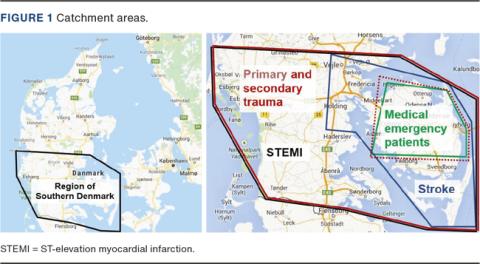 The catchment area covered by the different trigger calls varies and is described in Figure 1. The number of inhabitants provided for each trigger call catchment area is based on information from Statistic Denmark with 290,000 inhabitants in the primary catchment area for severe trauma (1,220,000 for selected trauma patients), 1,220,000 for suspected STEMI, 754,000 for suspected stroke and 290,000 for MEP.