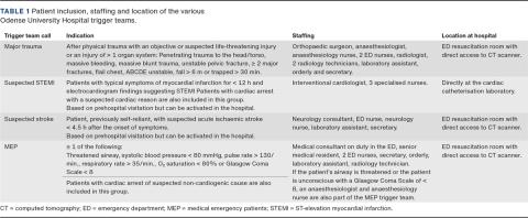 METHODS This was a single-centre, retrospective cohort study of all patients admitted to Odense University Hospital (OUH) from November 2012 to September 2015 with trauma, STEMI, stroke or MEP trigger team activation on arrival. OUH is a tertiary referral centre for patients with severe trauma, STEMI (directly referred to the catheterisation laboratory), stroke and MEP.
