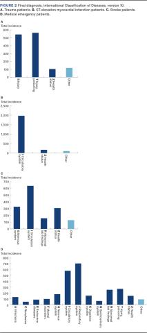 Whereas the patients from trauma, STEMI and stroke calls were discharged within 3-5 diagnostic main groups in the International Classification of Diseases, version 10 (ICD-10), patients from MEP calls had discharge diagnoses within 13 main ICD-10 coding areas (Figure 2). Further details regarding diagnostic discharge diagnosis for each trigger call are provided in Supplemental Tables s2a-d https://ugeskriftet.dk/files/a04210317_-_supplementary.pdf.