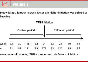 Two time periods were defined: the follow-up period and the control period (Figure 1 ). The follow-up period was the time from initiation of TNFi therapy until treatment was terminated or individual follow-up was concluded. The control period was defined as the corresponding time period for the individual patient immediately preceding TNFi initiation. TNFi initiation was defined as baseline. Data collection was concluded by the end of the first year of treatment. Variables were recorded continuously by the treating rheumatologists and collected at intervals of at least three months.