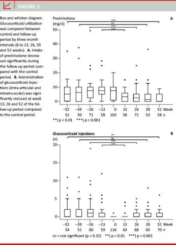 Conclusion: GC utilization is significantly reduced after initiation of TNFi treatment. Among patients on prednisolone at TNFi onset, prednisolone was withdrawn in one third and the dose was reduced in nearly half. Furthermore, the need for GC injections decreased.