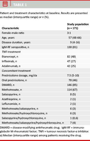 The computerized search yielded 251 candidate cases of which 80 could not be included. A total of 38 were only seen once before February 2010 and ten were followed for less than 13 weeks, 11 participated in RCTs, three were not treated with TNFi and two were not TNFi naïve. Two patients did not participate in the follow-up at OUH and one did not have RA. In 13 patients, baseline registration was incorrect. Finally, a total of 171 patients were included. In the study population, the female-male ratio was 3:1, the median age was 57 years, disease duration was nine years and 81% of the population was IgM-RF seropositive. TNFi with a concomitant DMARD was prescribed in 146 patients (85%), 133 (78%) of whom were treated with methotrexate as single or combination therapy (Table 1).