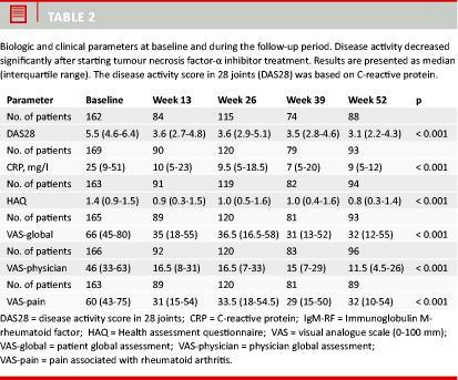 Results: The median daily prednisolone dose was significantly decreased after initiation of TNFi treatment (p < 0.01). At TNFi initiation, 78 patients (46%) received prednisolone compared with 53 (31%) by the end of follow-up. After TNFi initiation, 30 patients (38%) discontinued prednisolone and in 34 (44%) prednisolone dose was reduced. Similarly, the number of GC injections decreased significantly at 13, 26 and 52 weeks following TNFi initiation (p < 0.01).