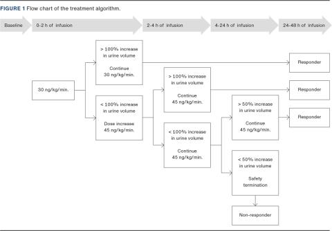 The dose of 30 ng/kg/min will be maintained for the whole study period if a clinically meaningful effect, ≥ 100% increase in urine volume versus baseline, is observed after 2 h (responders). If no such effect is observed, the dose will be increased to 45 ng/kg/min and maintained for another 2 h. If the increase in urine production at this time point is ≥ 100% versus baseline, treatment continues at the same dose in the remaining study period (responders). If the increase in urine production after 4 h is < 100% versus baseline, treatment continues at the same dose for another 20 h. If patients dosed at 45 ng/kg/min show a ≥ 50% increase in urine volume versus baseline at 24 h post-treatment initiation, they are continuously treated at this dose in the remaining study period (responders). If not, treatment is terminated early for safety reasons (non-responders) (Figure 1). Furthermore, incorporation of a transient treatment stop and an infusion rate reduction to 15 ng/kg/min make it possible to continue treatment of participants who develop hypotension (< 90 mmHg), assuming that these patients are more sensitive to ularitide. Blood pressure will be measured every 15 min for the first 6 h of infusion and thereafter at least once every 6 h.