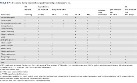 - Change in the sodium excretion rate at 24 h after infusion start and at the end of treatment versus baseline.