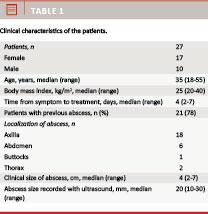 In this prospective study, 27 patients were enrolled between 20 April 2009 and 4 May 2010. Patients with clinical signs (tenderness, redness, swelling and fluctuant mass) of an uncomplicated abscess on the trunk were enrolled non-consecutively, five days a week at daytime.