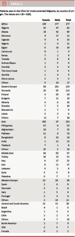 A total of 830 patients (39.75% women and 60.25% men) visited the clinic which led to a total of 2,088 visits and 1,384 ICPC-2 classifications. The age- and sex distribution among patients is presented in Table 1. The patients in the clinic were from Africa (33.4%), Eastern Europe (22.0%), Asia (18.3%), the Middle East (11.9%), Western Europe (8.7%), South and Central America (3.4%), North America (1.1%) and Oceania (0.2%). The clinic was visited by patients of 94 different nationalities, with the largest groups being from Romania (13.8%), Nigeria (9.9%), Ghana (7.0%), and the Philippines (6.0%) (see Table 2).
