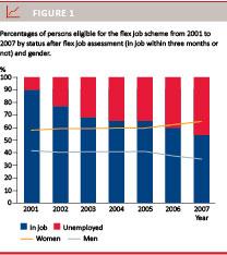 The proportion of unemployment benefit recipients grew with time from 10% in 2001 to 46% in 2007. In the same period, the number of flex job eligible persons rose from 8,520 to 10,343. The gender distribution also changed during this seven-year period: women’s percentage share rose from 58% to 65% (Figure 1).