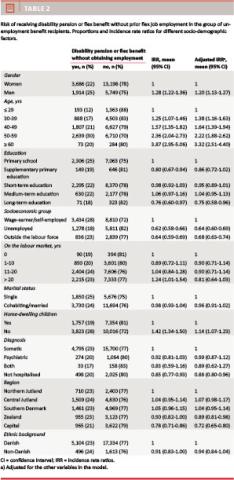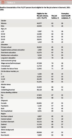 Material and methods: Persons included in the flex job scheme from 1 January 2001 to 30 March 2008 were identified via the Ministry of Employment’s DREAM register. Data were linked to Statistics Denmark and The Danish National Patient Registry. Among the